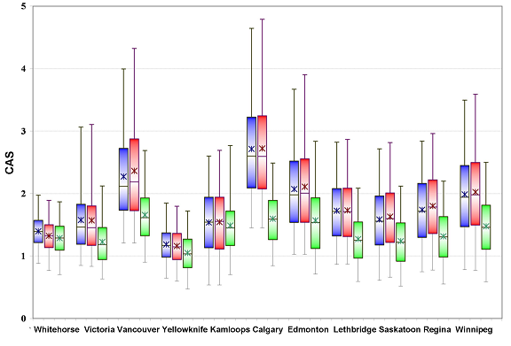 Les cotes air santé sont très semblables pour tous les scénarios pour les villes suivantes : Thunder Bay, Québec, Fredericton, Saint John, Halifax, Charlottetown, et Saint John. Pour ces villes, les valeurs sont les suivantes : Climat actuel et émissions actuelles, valeur médiane d'environ 1,5 à 1,6, valeur moyenne d'environ 1,6 à 1,8, fourchette du 25e au 75e centile d'environ 1,0 à 2,2, fourchette du 2e au 98e centile d'environ 0,5 à 4,0. Climat futur et émissions actuelles, valeur médiane d'environ 1,5 à 1,6, valeur moyenne d'environ 1,6 à 1,8, fourchette du 25e au 75e centile d'environ 1,0 à 2,2, fourchette du 2e au 98e centile d'environ 0,5 à 4,2. Climat futur et émissions du scénario 6 des profils représentatifs d'évolution de concentration, valeur médiane d'environ 1,0 à 1,5, valeur moyenne d'environ 1,1 à 1,6, fourchette du 25e au 75e centile d'environ 0,8 à 1,7, fourchette du 2e au 98e centile d'environ 0,4 à 2,7.