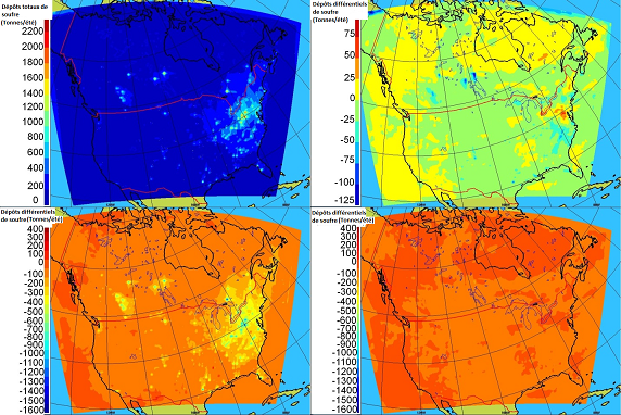 Dans le diagramme A, on voit la moyenne sur dix ans (climat actuel, émissions actuelles) du total de dépôts moyens estivaux de soufre dans la couche la plus basse du modèle. L'échelle va de 0 à 2 200 tonnes/été. La majorité du continent a des dépôts de l'ordre de 0 à 400 tonnes/été. Il y a de petits endroits isolés dans le corridor Calgary-Edmonton, près de Fort McMurray en Alberta, au nord de Saskatchewan, et à l'est de l'Ontario où les dépôts sont de l'ordre de 600 à 1 000 tonnes/été. Le nord-est des États-Unis, dans une région au sud d'une ligne entre Détroit et la ville de New York, et au nord de la frontière entre le Kentucky et le Tennessee, a des dépôts de l'ordre de 600 à 1 600 tonnes/été. Il y a également des petits secteurs isolés où les dépôts sont de l'ordre de 600 à 1 000 tonnes/été dans le sud-est des États-Unis.