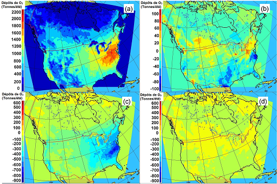 ![Figure 13.25 (a) Moyenne sur dix ans {climat actuel, émissions actuelles} du total de dépôts moyens estivaux d’ozone dans la couche la plus basse du modèle (tonnes/été). (b) Changements en matière de dépôts d’O3 [{climat futur, émissions actuelles} - {climat actuel, émissions actuelles}]. (c) Changements en matière de dépôts d’O3 [{climat futur, émissions liées au scénario 6 des profils représentatifs d’évolution de concentration} - {climat actuel, émissions actuelles}]. (d) Changements en matière de dépôts d’O3 [{climat futur, émissions actuelles} - {climat actuel, émissions actuelles}] (identique à (b), mais avec l’échelle de couleurs de (c) aux fins de comparaison). (Voir la description ci-dessous)](/content/dam/eccc/migration/main/air/1F36EFBB-941E-4A47-9236-944E9C5E8A65/Figure13.25.png)