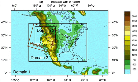 La figure 13.3 est une carte de l'Amérique du Nord sur laquelle sont superposées les domaines de réduction d'échelle utilisés pour les simulations régionales de recherches en prévisions météorologiques. Le domaine 1 correspond à toute la zone cartographiée, qui s'étend du cercle arctique, à peu près, jusqu'à l'équateur, et qui comprend une grande partie des océans Pacifique et Atlantique. Comme il est décrit dans le texte, le domaine du modèle de recherche en prévisions météorologiques le plus éloigné (domaine 2) couvre près de l'ensemble du continent nord-américain (du sud-est de l'Alaska et de la baie d'Hudson au nord jusqu'à la péninsule du Yucatán au sud) ainsi qu'une grande partie de la partie est de l'océan du Pacifique et de la partie ouest de l'océan Atlantique. Le domaine de modèle de 36 km (HadRM) couvre la région continentale ouest des États-Unis ainsi qu'une partie du Canada et du Mexique. Le domaine de modèle le plus interne (domaine 3) est centré sur le nord-ouest du Pacifique, qui comprend les États de Washington, de l'Oregon et de l'Idaho. La carte comprend également des parties ombragées qui représentent la hauteur du terrain (de 0 à 3 000 m) pour le domaine correspondant du modèle de recherche en prévisions météorologiques ou du modèle HadRM.