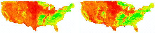 La carte à gauche montre la répartition des facteurs d'émission pour un scénario futur d'émissions biosynthétiques d'isoprène. Dans ce scénario, la couleur verte (facteurs d'émission plus élevés) couvre une grande partie de la même zone, à l'exception qu'il y a maintenant des zones en vert à proximité du Colorado, de Wyoming, et de l'est de la Californie. Les nouvelles zones en rouge comprennent des régions de la côte est et dans l'ensemble du sud de la Floride.