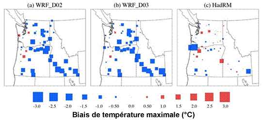 La figure 13.6 est composée de trois diagrammes qui montrent tous une carte au trait de Washington, de l'Oregon et de l'Idaho, et sur lesquels figurent des carrés qui indiquent selon leur dimension la moyenne annuelle des biais de température maximale (°C) du modèle aux stations du réseau de climatologie historique dans ces trois états. Le diagramme A montre les biais pour le domaine 2 du modèle de recherche en prévisions météorologiques, le diagramme B montre les biais du domaine 3 du modèle de recherche en prévisions météorologiques, et le diagramme C montre les biais pour le modèle HadRM. Une note indique que les données de la figure sont basées sur la combinaison de modèle/scénario ECHAM5-A1B et évaluées à l'aide des années 1970-2000.