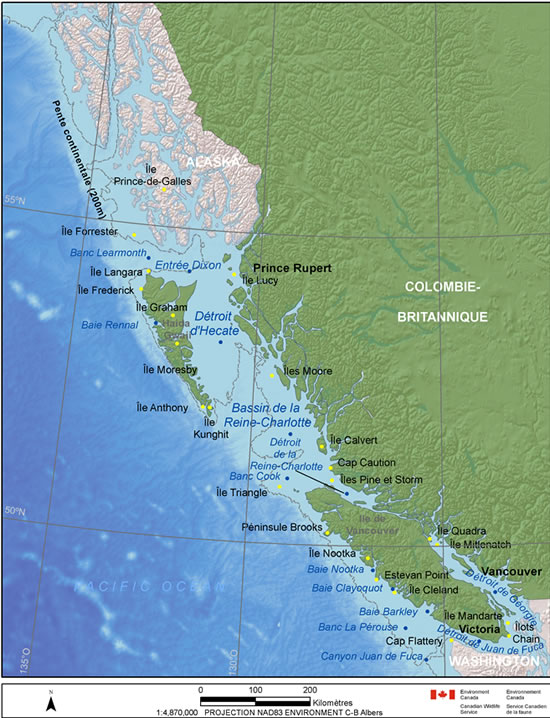 Carte illustrant la moitié ouest de la Colombie-Britannique, la côte sud de l'Alaska, l'extrémité nord de l'État de Washington et l'océan Pacifique; la carte montre les emplacements des caractéristiques terrestres et marines mentionnées dans le texte. Voici les caractéristiques marines et leurs emplacements approximatifs, du nord au sud : le banc Learmonth et l'entrée Dixon à l'extrémité nord de Haida Gwaii; la baie Rennal et le détroit d'Hécate situés sur les côtés ouest et est de Haida Gwaii, respectivement; le détroit de la Reine-Charlotte, entre l'île de Vancouver et Haida Gwaii; le détroit de la Reine-Charlotte, à l'est de l'extrémité nord de l'île de Vancouver; le banc Cook situé au large de l'extrémité nord-ouest de l'île de Vancouver; les baies ci-après situées à l'ouest de l'île de Vancouver (du nord au sud) : la baie Nootka, la baie Clayoquot et la baie Barkley; le banc La Pérouse et le canyon Juan de Fuca situés au large du sud-ouest de l'île de Vancouver; le détroit de Juan de Fuca, entre l'île de Vancouver et Washington, et le détroit de Georgia, entre l'île de Vancouver et la partie continentale de la Colombie-Britannique.