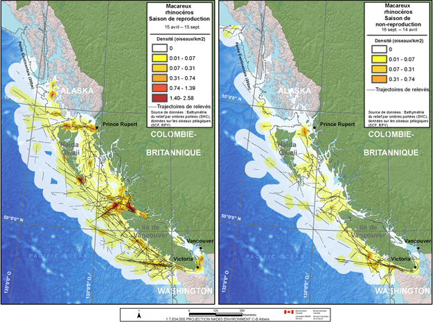 Carte illustrant la moitié ouest de la Colombie-Britannique, la côte sud de l'Alaska, l'extrémité nord de l'État de Washington et l'océan Pacifique. La carte est divisée en deux panneaux, qui montrent tous deux les densités de Macareux rhinocéros. Le panneau de gauche montre les densités durant la période de reproduction (du 15 avril au 15 septembre); le panneau de droite, les densités durant la période internuptiale (du 16 septembre au 14 avril).