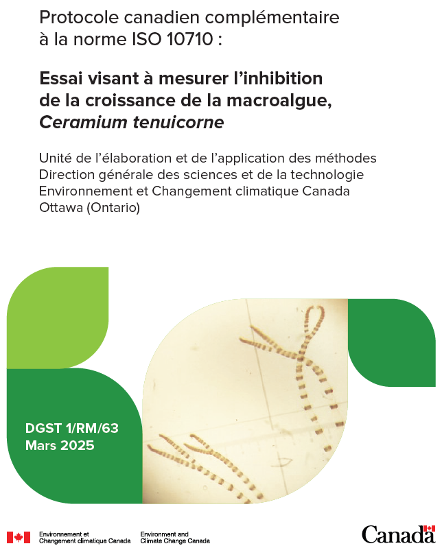 Afin de rétablir la souplesse qui existait antérieurement dans le choix des espèces d’essai, ECCC a examiné d’autres méthodes d’essai normalisées utilisant des espèces de macroalgues marines et s’est concentré sur la méthode normalisée ISO 10710 qui fait appel à Ceramium tenuicorne. Après avoir confirmé que Ceramium tenuicorne est pertinent sur le plan écologique dans l’environnement marin canadien (Garbary et McDonald, 1996; Sloan et Bartier, 2000; ECCC, 2020), l’Unité de l’élaboration et de l’application des méthodes (UEAM) d’ECCC a étudié la norme ISO (2010) et a élaboré des instructions et des conditions supplémentaires pour que cette norme soit compatible avec les autres essais de toxicité sublétale prescrits dans les règlements canadiens. Ce protocole complémentaire qui vise à mettre en application la méthode normalisée ISO 10710 dans le contexte canadien a été peaufiné grâce à des recherches effectuées dans un laboratoire commercial canadien (AquaTox, 2022, 2023; Nautilus Environmental, 2024). Comme il est indiqué à la section 1, ce protocole complémentaire doit être suivi conjointement avec la norme ISO 10710 (ISO, 2010).
