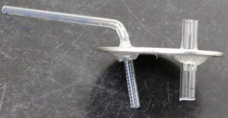 Voici une photographie du couvercle métallique mentionné ci dessus et de la pipette présentée à la figure I 3. La partie la plus courte de la pipette a été insérée dans le plus petit trou du couvercle et fixée à l’aide de silicone. Une section de 4 cm d’un tube souple de 5/16 po a été insérée dans le plus gros trou et fixée à l’aide de silicone.