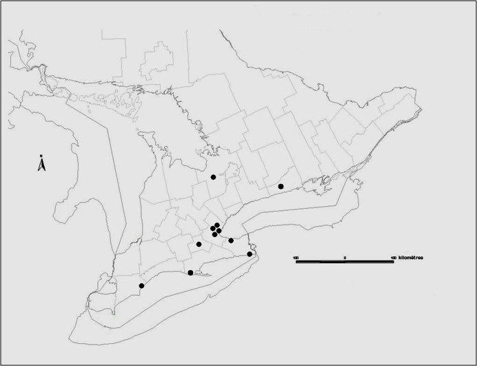 - Figure 4. Localités approximatives des observations du Terrapene carolina dans le sud de l’Ontario au XXe siècle.