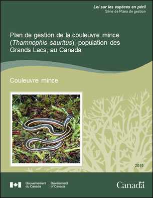 Environnement Canada. 2015. Plan de gestion de la couleuvre mince (Thamnophis sauritus), population des Grands Lacs, au Canada, Série de Plans de gestion de la Loi sur les espèces en péril, Environnement Canada, Ottawa, iv + 25 p.