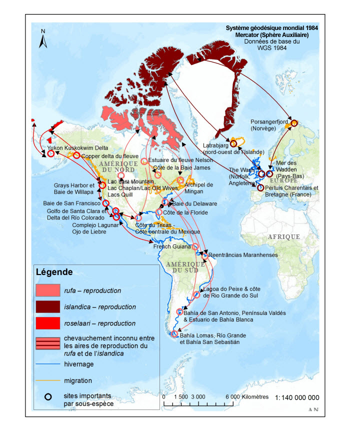 De nouvelles données sur la répartition et l’abondance de la population de Calidris canutus roselaari (ci-après « roselaari ») ont été obtenues depuis l’évaluation du Bécasseau maubèche (Calidris canutus) par le COSEPAC, en 2007. Selon les résultats d’activités de baguage et de géolocalisation ainsi que des travaux antérieurs sur les isotopes stables (Atkinson et al., 2005), les Bécasseaux maubèches non nicheurs, que l’on prenait autrefois pour des roselaari le long de la côte ouest de la Floride, du sud-est des États-Unis et du nord du Brésil, sont probablement des Calidris canutus rufa (ci-après « rufa ») (Niles et al., 2008; Andres et al., 2012), et la quasi-totalité, voire la totalité, des Bécasseaux maubèches non nicheurs dans le nord-ouest du golfe du Mexique sont aussi des rufa (U.S. Fish and Wildlife Service, 2014). Ces données récentes indiquent que les roselaari sont principalement confinés à la côte du Pacifique de l’Amérique du Nord et de l’Amérique du Sud. Cette sous-espèce ne se reproduit pas dans l’ouest de l’Arctique canadien, contrairement à ce que l’on croyait et des liens évidents ont été tracés entre différents sites d’hivernage du nord-ouest du Mexique, des haltes migratoires dans l’État de Washington aux États-Unis et des aires de reproduction dans le nord-ouest et le nord de l’Alaska ainsi que sur l’île Wrangel en Russie (Buchanan et al., 2010, 2011; U.S. Fish and Wildlife Service, 2011; Andres et al., 2012; Carmona et al., 2013). Sa présence est considérée comme accidentelle au Yukon (Environment Yukon, 2014). Le U.S. Fish and Wildlife Service (2011) indique que la sous-espèce roselaari contourne le plus souvent la Colombie-Britannique pendant la migration.