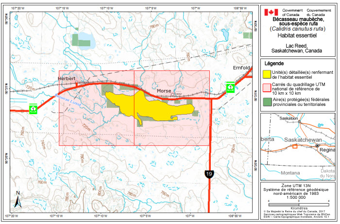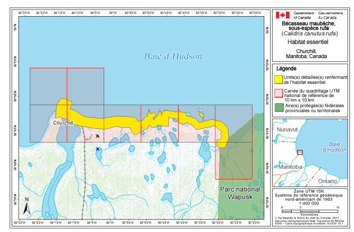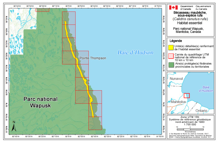 Le présent document a été préparé par Julie McKnight (Environnement et Changement climatique Canada, Service canadien de la faune [ECCC SCF] – Région de l'Atlantique) avec la généreuse contribution de Garry Donaldson (ECCC SCF – Région de l'Atlantique) et des membres du Comité technique sur les oiseaux de rivage d'Environnement et Changement climatique Canada, particulièrement Cheri Gratto-Trevor (ECCC – Direction générale de la science et de la technologie (ECCC S T) – Recherche sur les espèces sauvages), Anne McKellar (ECCC-SC - Région des Prairies et du Nord), Jennie Rausch (ECCC SCF – Région des Prairies et du Nord), Christian Friis (ECCC SCF – Région de l'Ontario), R.I.G. Morrison (ECCC S T, Recherche sur les espèces sauvages), Cynthia Pekarik (ECCC-SCF - Région de la capitale nationale), Paul Smith (ECCC S T – Recherche sur les espèces sauvages), Yves Aubry (ECCC SCF – Région du Québec) et Julie Paquet (ECCC SCF – Région de l'Atlantique). Nous remercions Kristiina Ovaska d'avoir facilité l'appel avec des experts du calculateur de menaces pour le rufa, David Andrews (ECCC SCF – Région de l'Atlantique) d'avoir réalisé les cartes incluses dans le présent document et Patricia M. González pour avoir fourni des conseils sur une version antérieure. Nous offrons aussi notre reconnaissance et nos remerciements à toutes les autres parties qui ont fourni des conseils et des renseignements ayant contribué à l'élaboration du présent document, y compris divers organismes et particuliers autochtones, des gouvernements provinciaux et territoriaux, d'autres ministères fédéraux (p. ex. Agence Parcs Canada), des propriétaires fonciers, des citoyens et divers intervenants.