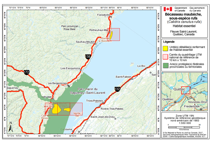 Le rufa est inscrit comme espèce « en voie de disparition », le roselaari comme espèce « menacée » et l’islandica comme espèce « préoccupante » à l’annexe 1 de la Loi sur les espèces en périf (LEP) du gouvernement fédéral. Le tableau 1 présente les cotes de conservation du Bécasseau maubèche. L’Ontario, le Nouveau-Brunswick, la Nouvelle-Écosse et Terre-Neuve-et-Labrador ont inscrit le rufa dans leurs lois sur les espèces en péril respectives. Au Québec, le rufa est inscrit à la Liste des espèces de la faune vertébrée susceptibles d’être désignées menacées ou vulnérables. Cette liste est produite aux termes de la Loi sur les espèces menacées ou vulnérables (RLRQ, chap. E-12.01). L’islandica et le roselaari ne sont inscrits dans aucune loi provinciale ou territoriale relative aux espèces en péril.