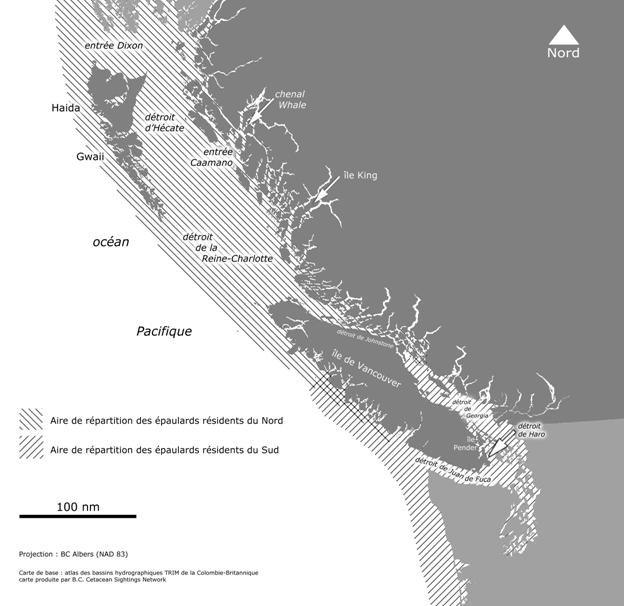 Il est important de tenir compte du fait que les résidents du nord et du sud ont surtout fait l’objet d’études menées dans des eaux protégées entre les mois de mai à octobre (Ford et al., 1998, 2000). On connaît peu leur comportement et leur écologie dans d’autres zones.