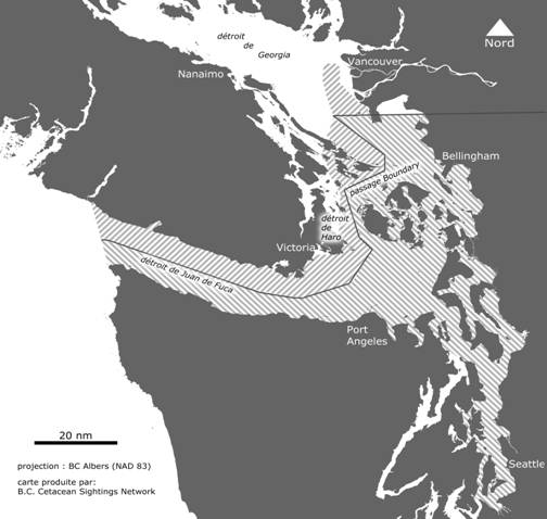 La communauté d’épaulards résidents du Sud est constituée d’un seul clan acoustique, le clan J, qui est composé de trois groupes familiaux (appelés J, K et L) comprenant 20 lignées maternelles en tout (Ford et al., 2000). L’aire de répartition connue de cette communauté s’étend du nord de la Colombie-Britannique jusqu’au centre de la Californie (Ford et al., 2000; données non publiées, programme de recherche sur les cétacés, Pêches et Océans Canada, Station de biologie du Pacifique, Nanaimo, C.-B., PRC-MPO). Pendant l’été, on trouve habituellement les membres de cette communauté dans les eaux au large du sud de l’île de Vancouver et du nord de l’État de Washington, où ils se rassemblent pour intercepter le saumon migrateur. La principale zone de concentration des résidents du Sud est le détroit de Haro et les environs du sud-est de l’île de Vancouver (figure 2), mais ils sont généralement vus dans le détroit de Juan de Fuca et au sud du détroit de Georgia (Ford et al., 2000). Des trois groupes familiaux d’épaulards résidents du Sud, le groupe J est le plus souvent observé dans les eaux intérieures au cours de l’année et semble rarement quitter la zone du détroit de Georgia, du détroit de Puget et du détroit de Juan de Fuca (Ford et al., 2000). On a noté la présence des groupes K et L le plus souvent à l’ouest du détroit de Juan de Fuca et en dehors des rives extérieures de l’État de Washington et de l’île de Vancouver. Contrairement au groupe J, les groupes K et L quittent habituellement les eaux côtières à l’hiver et y retournent en mai et juin. On en connaît peu sur leur habitat au cours de cette période, mais ils ont été aperçus aussi loin au sud qu’à Monterey Bay (Californie) et aussi loin au nord que l’île Langara, à l’extérieur de Haida Gwaii (Ford et al., 2000; Black et al., 2001, données non publiées, PRC-MPO).
