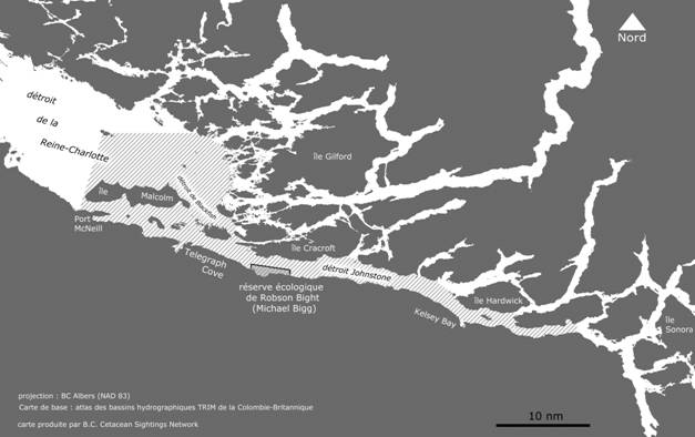 Justification de la désignation : La population d’épaulards résidents du Sud est de petite taille et a diminué de 17 % entre 1995 et 2001 et compte actuellement 85 membres. La population d’épaulards résidents du Nord est également de petite taille (205 membres) et a diminué de 7 % entre 1997 et 2003. En saison, les épaulards sont exposés à un trafic maritime intense. La disponibilité de leurs proies est réduite comparativement aux niveaux historiques. Des concentrations élevées de polluants organiques persistants peuvent compromettre leur système immunitaire et reproductif, menant à une diminution du taux de mise bas ou à une augmentation du taux de mortalité.