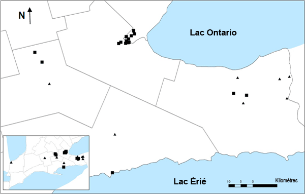 On compte actuellement huit populations existantesnote13 de frasère de Caroline au Canada, toutes situées dans le sud de l’Ontario (voir le tableau 1 et la figure 1). Six autres populations ont probablement disparu dans le comté de Lambton (une population), le comté d’Oxford (une population), le comté de Brant (une population), la ville de Hamilton (une population) et la municipalité régionale de Niagara (deux populations) (COSEWIC, 2006). La situation d’une population dans le comté de Haldimand et d’une sous population située au sein de la population de la région de Halton et de Hamilton (Borer’s Creek Conservation Area) est inconnue; aucun individu n’a été répertorié à ces sites depuis 1989.