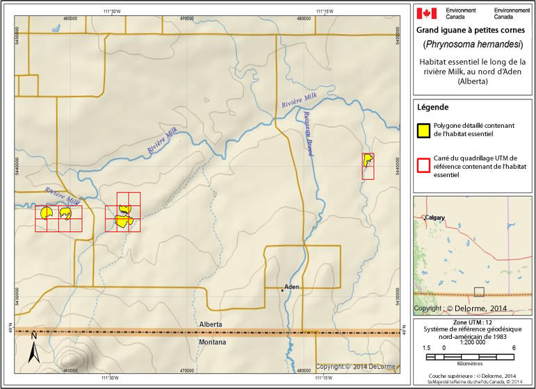 L'habitat essentiel du grand iguane à petites cornes est partiellement désigné, dans la mesure du possible, dans le sud-est de l'Alberta et le sud-ouest de la Saskatchewan, d'après les meilleurs renseignements accessibles sur l'occupation historique et actuelle de l'espèce ainsi que sur le caractère convenable de l'habitat. L'habitat essentiel qui est désigné dans le présent programme de rétablissement pour le grand iguane à petites cornes se trouve dans 539 quarts de sectionNote1de bas de page.