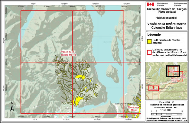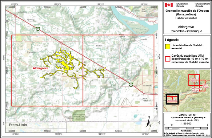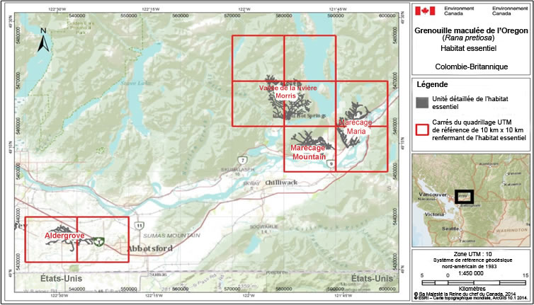 L’habitat essentiel est désigné autour de quatre emplacements connus occupés par la grenouille maculée de l’Oregon dans les bassesterres continentales de la Colombie-Britannique : Aldergrove, marécage Mountain, marécage Maria et vallée de la rivière Morris. Les figures A.1 à A.5, à l’annexe 1, montrent les zones renfermant de l’habitat essentiel de la grenouille maculée de l’Oregon. Les polygones ombrés en jaune correspondent aux zones où les critères décrits dans cette section sont respectés, et représentent l’habitat essentiel, exception faite des zones où il y a des surfaces imperméables. Le quadrillage UTM de 10 km x 10 km montré dans ces figures est un système de quadrillage national de référence qui met en évidence l’emplacement géographique général renfermant de l’habitat essentiel à des fins d’aménagement du territoire et/ou d’évaluation environnementale.