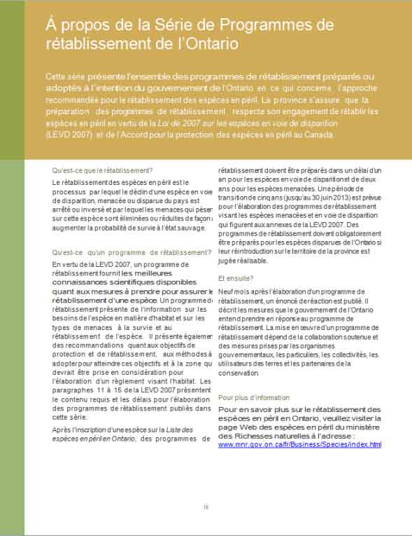 Cette déclaration est la réponse du gouvernement de l'Ontario aux conseils scientifiques fournis dans le programme de rétablissement. En plus de se fonder sur les renseignements fournis dans le programme de rétablissement, elle tient compte des commentaires reçus de la part de parties