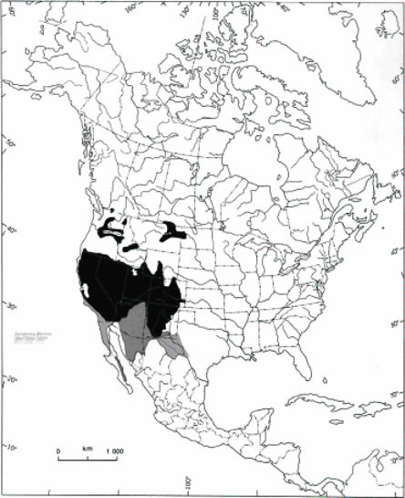 La figure 3 montre une carte de l'Amérique du Nord sur laquelle les zones en gris dans l'ouest du continent représentent des régions qu'Opler (1999) a exclues de l'aire de répartition de l'Apodemia mormo.