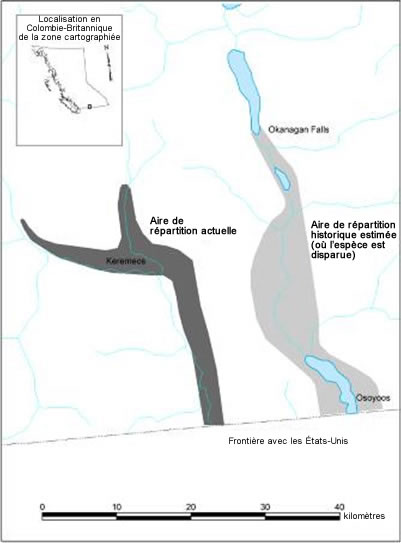 La figure 4 montre l'aire de répartition de la population de mormons des montagnes du Sud de la Colombie-Britannique. La figure montre l'aire de répartition actuelle dans le centre-sud de la Colombie-Britannique, laquelle s'étend des environs de Keremeos jusqu'à la frontière avec les États-Unis. La figure montre également une aire de répartition historique estimée d'où l'espèce a disparu, laquelle s'étend d'Okanagan Falls jusqu'à Osoyoos au sud.