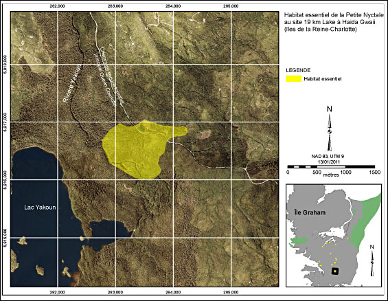 Carte montrant l’habitat essentiel de la Petite Nyctale au site 19 km Lake à Haida Gwaii. On y voit l’emplacement de ce site au centre-sud de l’île Graham, près du lac Yakoun, sur le chemin de service forestier principal Queen Charlotte. Le polygone mesure environ 1 000 m de largeur et 1 000 m de longueur. Les coordonnées en UTM du centre du polygone sont 5916500 Nord, 283400 Est (NAD 83, zone UTM 9).