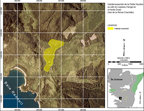 Carte montrant l’habitat essentiel de la Petite Nyctale au site du ruisseau Hangover, le long du littoral sud-ouest de l’île Graham, dans la baie Rennel. Le polygone mesure environ 400 m de largeur (est à ouest) et 1 400 m de longueur (nord à sud). Les coordonnées en UTM du centre du polygone sont 5925000 Nord, 266500 Est (NAD 83, zone UTM 9).