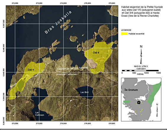 Carte montrant l’habitat essentiel de la Petite Nyctale aux sites Dat 1/5 (polygone ouest) et Dat 3/4 (polygone est) à Haida Gwaii. On y voit l’emplacement des deux polygones le long du littoral sud de l’inlet Juskatla au large de l’inlet Masset, à l’île Graham, immédiatement au nord du chemin de service forestier principal Datlamen. Le polygone Dat 1/5 mesure environ 400 m de largeur (nord-ouest à sud-est) et 2 000 m de longueur (sud-ouest à nord-est). Les coordonnées en UTM du centre du polygone sont 5944800 Nord, 272400 Est (NAD 83, zone UTM 9). Le polygone Dat 3/4 mesure environ 800 m de largeur (nord à sud) et environ 1 200 m de longueur (sud à nord). Les coordonnées en UTM du centre du polygone sont 5945600 Nord, 275500 Est (NAD 83, zone UTM 9).