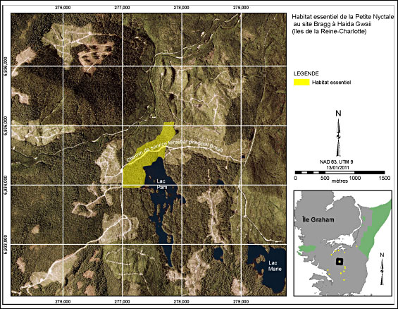 Carte montrant l’habitat essentiel de la petite Nyctale au site Bragg à Haida Gwaii. On y voit l’emplacement du polygone au centre-sud de l’île Graham, au nord du lac Pam, le long du chemin de service forestier Bragg. Le polygone mesure environ 600 m de largeur (nord à sud) et environ 1 000 m de longueur (est à ouest). Les coordonnées en UTM du centre du polygone sont 5940700 Nord, 268600 Est (NAD 83, zone UTM 9).