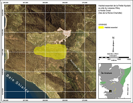 Carte montrant l’habitat essentiel de la Petite Nyctale au site du ruisseau Riley à Haida Gwaii. On y voit l’emplacement de ce site le long du littoral sud-ouest de l’île Graham, près du ruisseau Riley. Le polygone mesure environ 600 m de largeur (nord à sud) et 1 600 m de longueur (est à ouest). Les coordonnées en UTM du centre du polygone sont 5921100 Nord, 268400 Est (NAD 83, zone UTM 9).