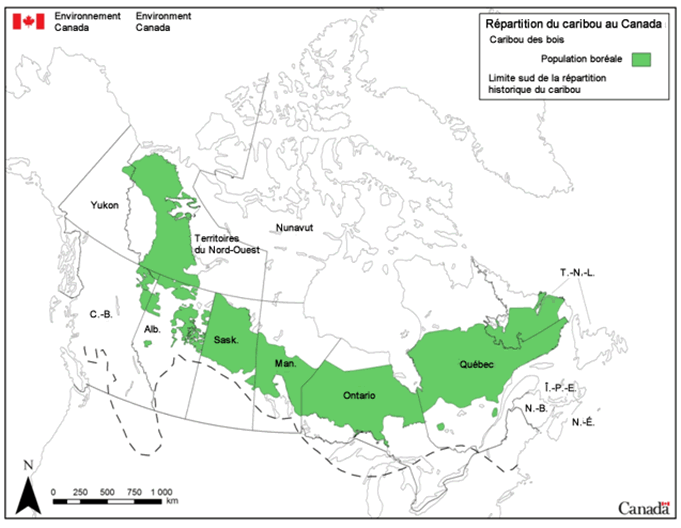 Le présent programme de rétablissement met l'accent sur la population boréale du caribou des bois (Rangifer tarandus caribou), ci-après appelé « caribou boréal »; en mai 2002, cette espèce a été désignée espèce « menacée » par le Comité sur la situation des espèces en péril au Canada (COSEPAC). Le caribou boréal est réparti dans l'ensemble du Canada dans sept provinces et deux territoires, du coin nord-est du Yukon jusqu’au Labrador vers l’est, ainsi que vers le sud jusqu’au lac Supérieur.