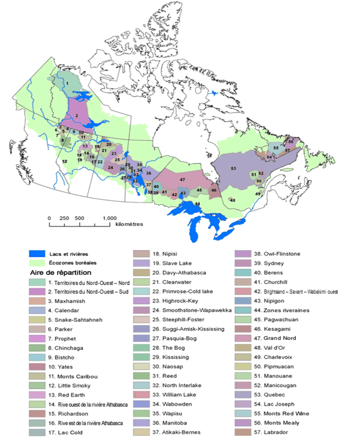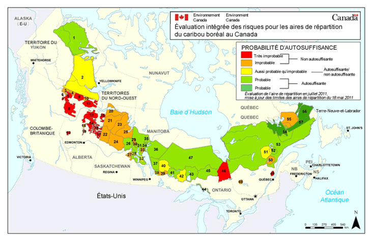 - La plupart des aires de répartition du caribou boréal au Canada n'ont pas été entièrement décrites en raison d'un manque de données normalisées sur l'emplacement des animaux et d'une mauvaise compréhension des mouvements au sein des aires de répartition. Bien que 57 aires de répartition soient toujours actuellement reconnues par les compétences responsables au Canada, des changements ont été apportés à la délimitation des aires de répartition du caribou boréal depuis l'évaluation scientifique de 2008, par différentes compétences, en fonction de différents critères. La question de la délimitation appropriée des aires de répartition transfrontalières demeure non résolue.