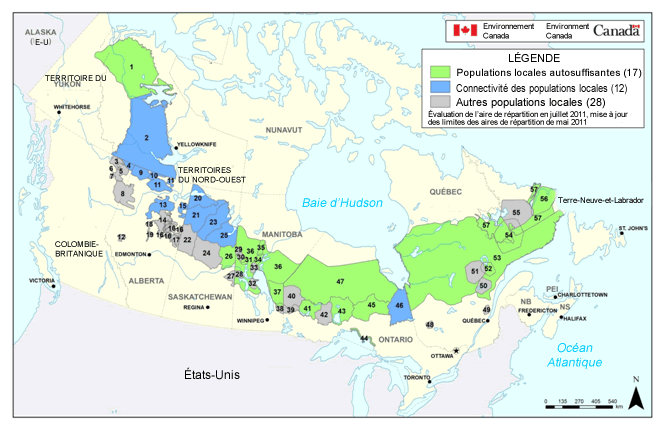 Oui. Selon nos meilleures estimations actuelles, environ 32 000[1] individus sont répartis dans au moins 57 populations locales, dans neuf provinces et territoires au Canada, et ils sont en mesure de se reproduire et disponibles pour améliorer les taux de croissance et l'abondance des populations locales (Environnement Canada, 2011b).