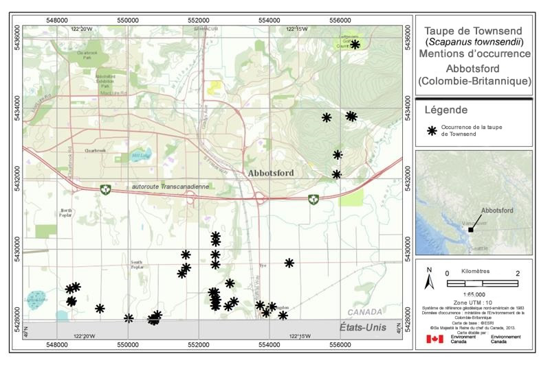 Un inventaire à jour est nécessaire pour déterminer la répartition et l’emplacement actuels de tous les territoires actifs de l’espèce en Colombie-Britannique. Touts les sites connus abritant des taupes de Townsend dont il est question dans le rapport de situation du COSEPAC (2003) et dans Sheehan et Galindo-Leal (1996b), de même que les nouveaux territoires découverts de 2007 à 2010 dans le cadre d’évaluations environnementales et une occurrence rapportée dans une zone résidentielle, en 2010, devraient être réévalués (S. Letay, comm. pers., 2014). Cet inventaire devrait recenser tous les territoires actifs de la taupe de Townsend, de même que les propriétaires terriens ou fonciers dont les terrains abritent des taupes de Townsend. L’identification des habitats potentiels est une stratégie à plus long terme. Un modèle d’habitat fondé sur toutes les occurrences existantes connues devrait être élaboré pour déterminer les habitats potentiels et pour évaluer la fragmentation de l’habitat et les besoins en matière de protection. Le recensement des habitats potentiels dans l’État de Washington visant à déterminer s’il existe des territoires inconnus abritant l’espèce ainsi que des zones d’habitat potentiellement inoccupées près de la frontière canadienne aiderait à déterminer s’il existe une connectivité possible avec les populations de l’État de Washington.