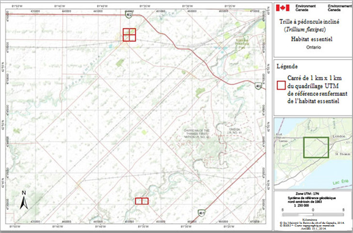 Au Canada, le trille à pédoncule incliné se rencontre uniquement en deux emplacements à l'intérieur de la zone carolinienne, dans le sud-ouest de l'Ontario (figure 1). L'espèce sera donc toujours vulnérable aux facteurs de stress anthropiques et aux événements stochastiques.
