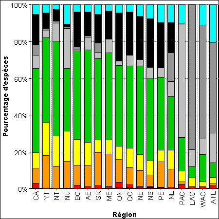 La figure 3-5 compare les classifications de la situation générale au Canada («classification nationale») de 2005 entre les régions, à l'exception des espèces disparues, disparues du Canada, indéterminées, non-évaluées, exotiques et occasionnelles. Au Yukon, 22% des espèces étaient classées possiblement en péril, 22% sensibles et 70% en sécurité. Dans les Territoire du Nord-Ouest, 15% des espèces étaient possiblement en péril, 21% sensibles et 56% en sécurité. Au Nunavut, 22% des espèces étaient possiblement en péril, 25% sensibles et 52% en sécurité. En Colombie-Britannique, 2% des espèces étaient en péril, 14% possiblement en péril, 19% sensibles et 65% en sécurité. En Alberta, 1% des espèces étaient en péril, 15% possiblement en péril, 17% sensibles et 67% en sécurité. En Saskatchewan, 2% des espèces étaient en péril, 26% possiblement en péril, 10% sensibles et 63% en sécurité. Au Manitoba, 2% des espèces étaient en péril, 24% possiblement en péril, 11% sensibles et 64% en sécurité. En Ontario, 4% des espèces étaient en péril, 19% possiblement en péril, 11% sensibles et 66% en sécurité. Au Québec, 3% des espèces étaient en péril, 14% possiblement en péril, 16% sensibles et 67% en sécurité. Au Nouveau- Brunswick, 1% des espèces étaient en péril, 13% possiblement en péril, 13% sensibles et 73% en sécurité. En Nouvelle-Écosse, 1% des espèces étaient en péril, 10% possiblement en péril, 13% sensibles et 76% en sécurité. À l’Île-du-Prince-Édouard, 23% des espèces étaient possiblement en péril, 11% sensibles et 66% en sécurité. À Terre-Neuve et Labrador, 1% des espèces étaient en péril, 20% possiblement en péril, 21% sensibles et 58% en sécurité. Dans la région de l’océan Pacifique, 9% des espèces étaient en péril, 5% possiblement en péril, 21% sensibles et 65% en sécurité. Dans la région de l’océan Arctique Est, 10% des espèces étaient en péril, 40% sensibles et 50% en sécurité. Dans la région de l’océan Arctique Ouest, 10% des espèces étaient en péril, 13% sensibles et 80% en sécurité. Dans la région de l’océan Atlantique, 8% des espèces étaient en péril, 10% possiblement en péril, 25% sensibles et 57% en sécurité.