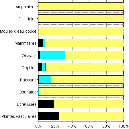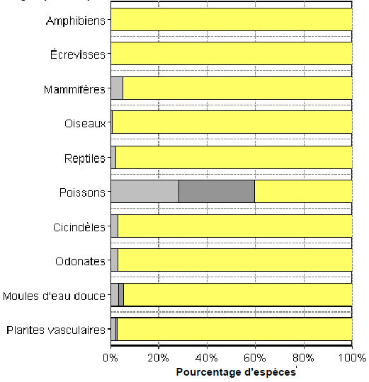 La figure 3-8 compare la proportion d’espèces indéterminées et non-évaluées entre les groupes d’espèces. Les amphibiens et les écrevisses n’incluaient aucune espèce indéterminée ou non-évaluée. Les mammifères comportaient 5% d’espèces indéterminées et aucune espèce non-évaluée. 1% des espèces d’oiseaux étaient indéterminées et aucune non-évaluée. 2% des espèces de reptiles étaient indéterminées et aucune non-évaluée. 28% des espèces de poissons étaient indéterminées et 32% non-évaluées. 3% des espèces de cicindèles étaient indéterminées et aucune non-évaluée. 3% des espèces d’odonates étaient indéterminées et aucune non-évaluée. 4% des espèces de moules d’eau douces étaient indéterminées et 2% non-évaluées. 2% des espèces de plantes vasculaires étaient indéterminées et 1% non-évaluées.