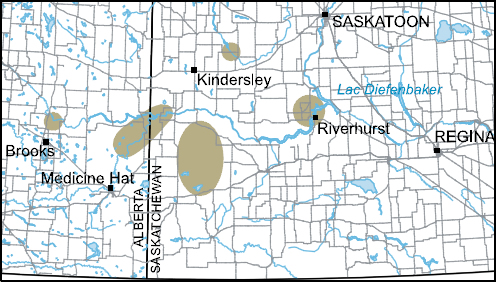 Voici la carte de l’aire de répartition du chénopode glabre dans les formations de dunes en Alberta et en Saskatchewan. L’espèce est présente entre Lethbridge et Saskatoon, et dans les formations de dunes, à l’est et à l’ouest de Brandon.