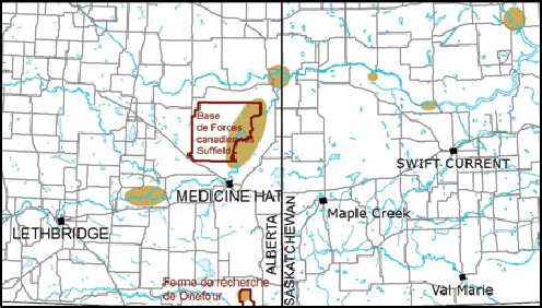 Voici la carte de l’aire de répartition du cryptanthe minuscule dans le sud-est de l’Alberta et juste de l’autre côté de la frontière, en Saskatchewan. L’espèce est présente le long de la rivière Saskatchewan Sud, entre Lethbridge et le nord de la Base des Forces canadiennes Suffield, et jusqu’à la frontière entre l’Alberta et la Saskatchewan, ainsi qu’à la station de recherche de Onefour, en Alberta.