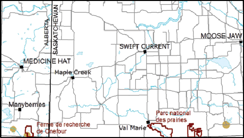 Voici la carte de l’aire de répartition du yucca glauque dans le sud-est de l’Alberta et de la Saskatchewan. En Alberta, l’espèce est présente à la station de recherche de Onefour et dans la réserve de pâturage provinciale de Pinhorn, dans le bassin de drainage de la rivière Milk. En Saskatchewan, elle est présente près de Fife Lake, à l’est du parc national des Prairies.