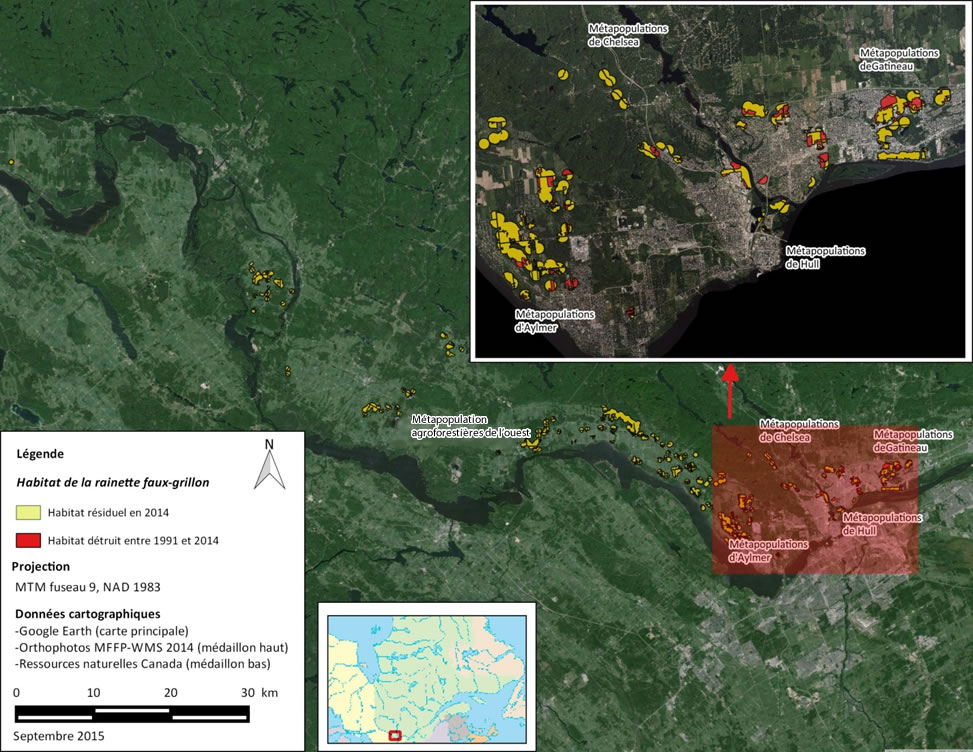 Carte montrant l'habitat convenable détruit entre 1991 et 2014 et l'habitat convenable résiduel en 2014 de la rainette faux-grillon de l'ouest dans cinq métapopulations de l'Outaouais. Celles-ci sont, d'est en ouest, les métapopulations de Gatineau, les métapopulations de Hull, les métapopulations de Chelsea, les métapopulations d'Aylmer et les métapopulations agroforestières de l'ouest.