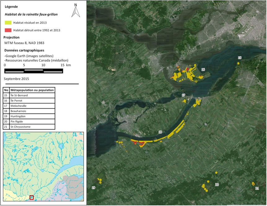 En Montérégie, l'analyse des tendances en matière d'habitat (de 1992 à 2013) montre une réduction de l'habitat convenable de la rainette faux-grillon de l'ouest de l'ordre de 23,6 % (7,26 km2) (tableau 2, figure 4, figure 5). La métapopulation affichant la baisse la plus marquée est celle de La Prairie. Dans certaines populations isolées (p. ex. St-Chrysostome, Pin rigide, refuge Marguerite d'Youville), même s'il reste d'importantes quantités d'habitat convenable, aucune rainette faux-grillon de l'ouest n'a été observée dans ces endroits au cours des dernières années. De plus, bien que de l'habitat puisse avoir semblé convenable dans le cadre de l'analyse géospatiale, il pourrait avoir été détruit par des castors ou par la succession de l'habitat en forêts à couvert fermé. Dans les métapopulations du bois de Brossard Sud et du boisé du Tremblay, des portions de l'habitat qui semblaient toujours convenables pour la rainette faux-grillon de l'ouest ont été détruites, selon Picard (2015), par des barrages de castors.