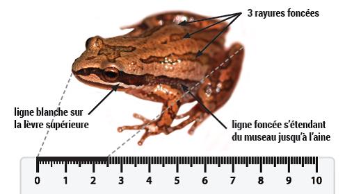 Le schéma montre une rainette faux-grillon de l'ouest dont les principales caractéristiques permettant de l'identifier sont pointées avec des bulles d'information. On y voit la lèvre supérieure pâle, les trois rayures dorsales foncées et la ligne foncée qui va du museau à l'aine. Une règle complète le schéma montrant la longueur de 2,5 cm.