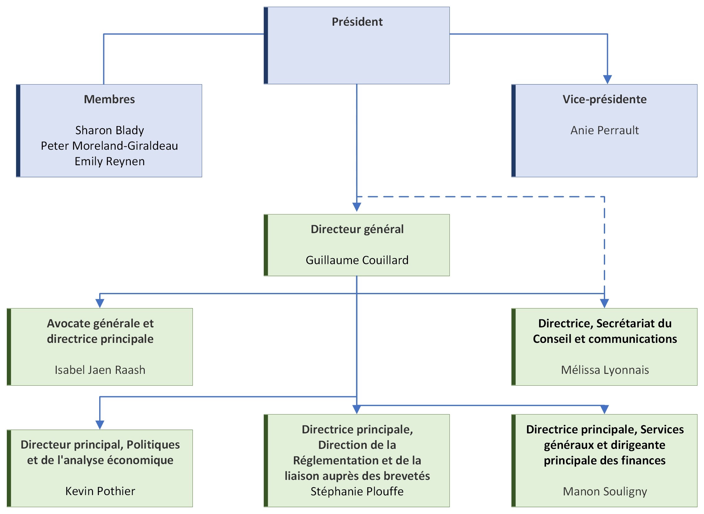 Le Conseil est formé d'au plus cinq membres siégeant à temps partiel, dont un président et un vice-président. Les membres du Conseil sont nommés par le gouverneur en conseil. En vertu de la Loi sur les brevets, le président du Conseil assume également les fonctions de chef de la direction du CEPMB et, à ce titre, assure la supervision et la direction des activités du Conseil. Par effet de la loi, le vice-président, en cas d’absence ou d’empêchement du président, ou de vacance de son poste, assume la présidence.