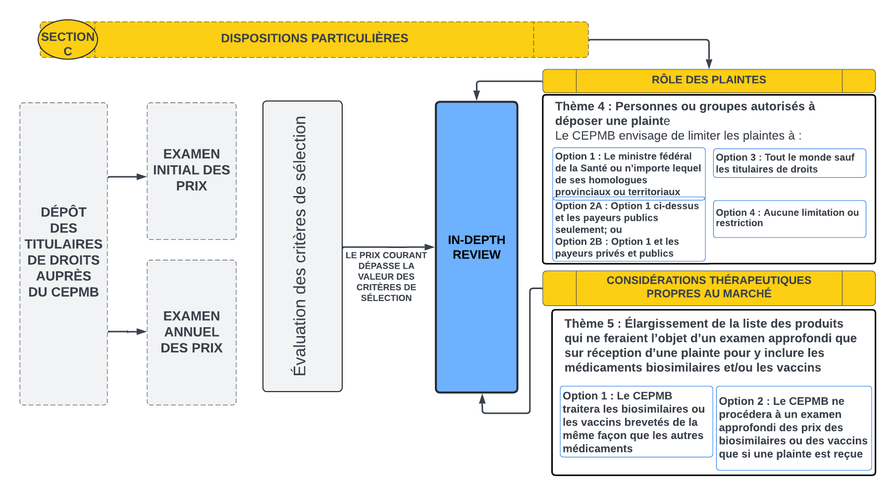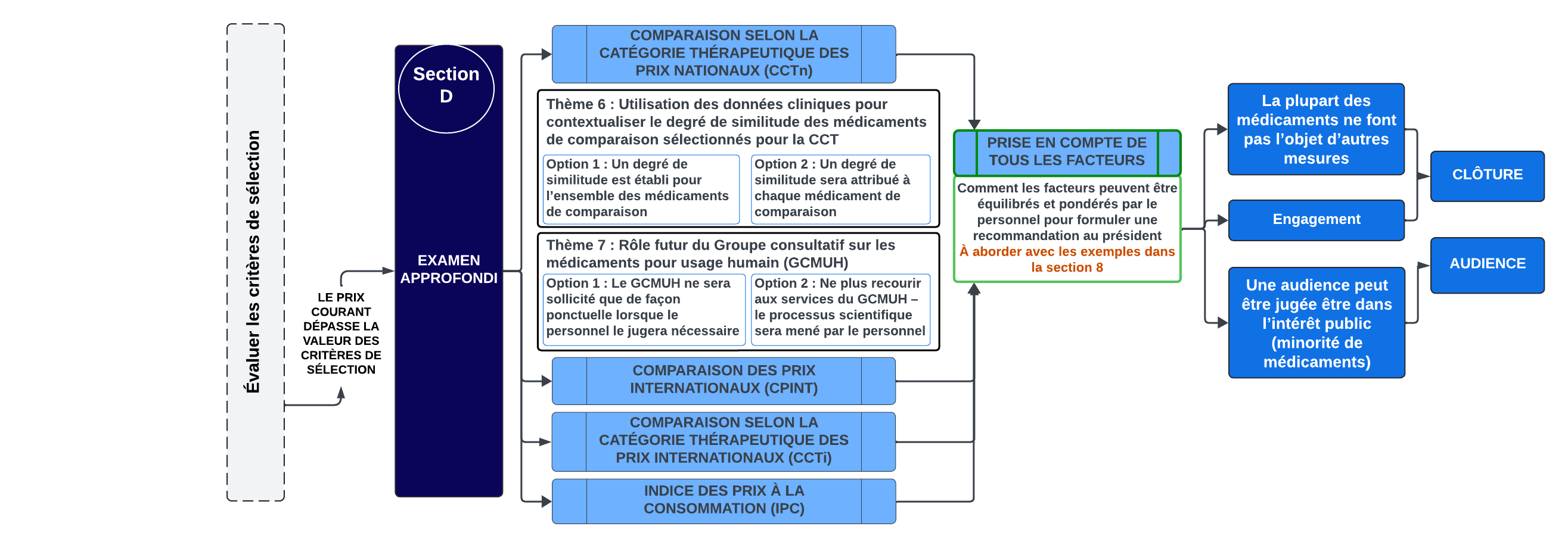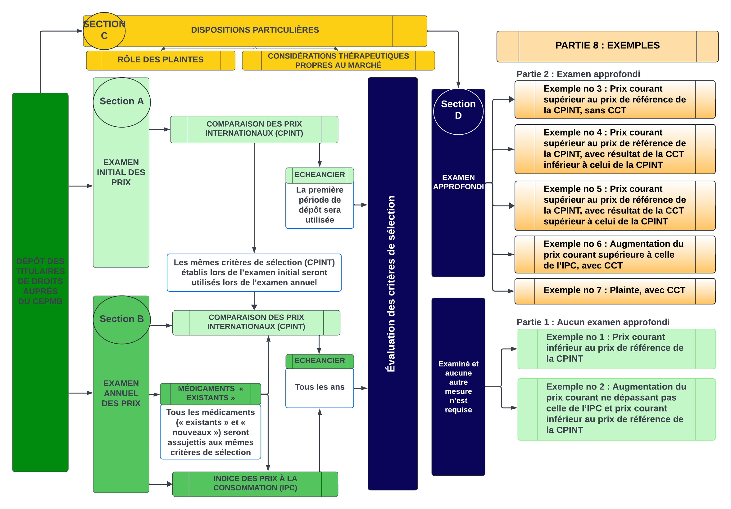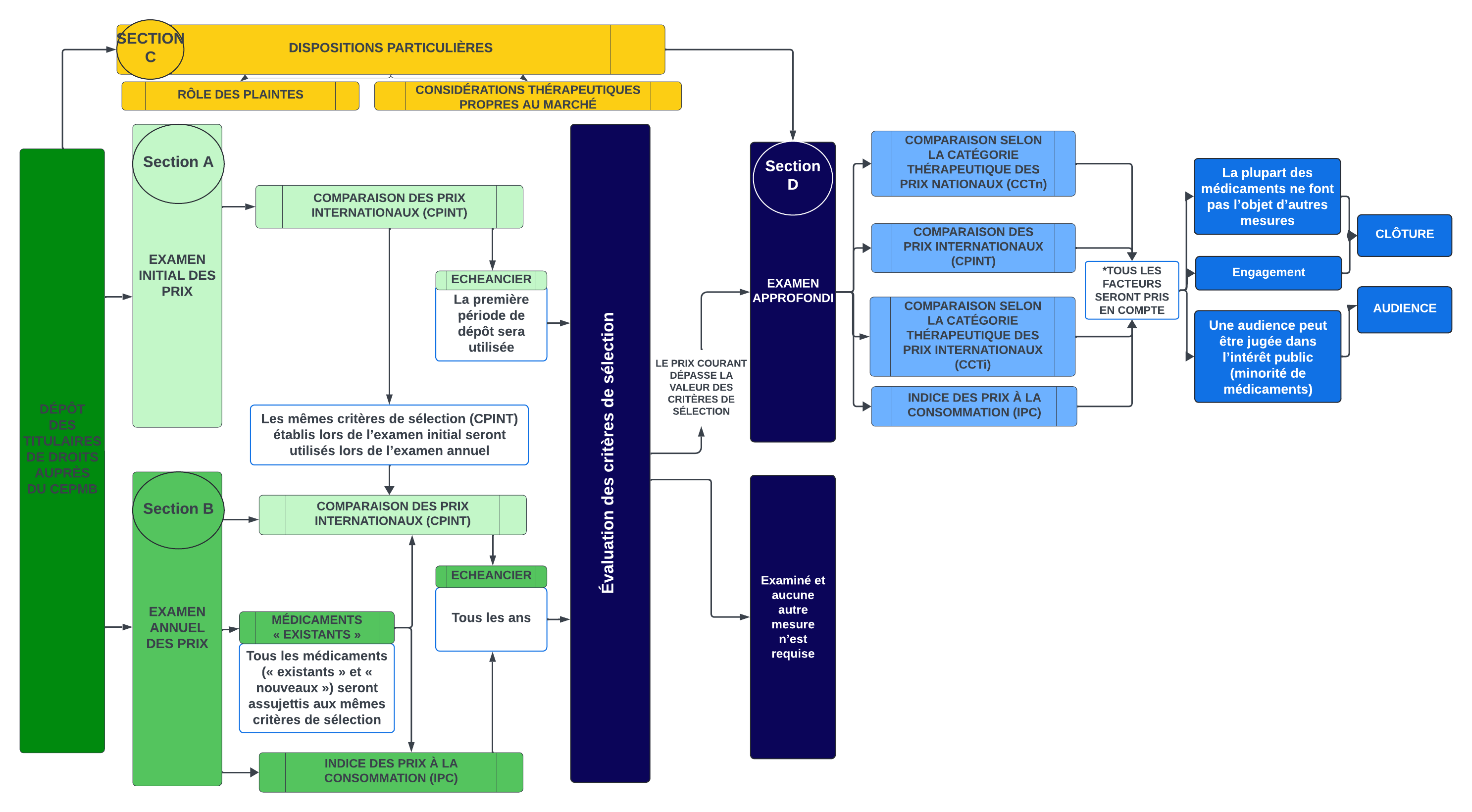 La structure de base du processus d’examen des prix envisagé par le Conseil peut être décrite en quatre parties principales (« Sections ») : Section A : Examen initial des prix; Section B : Examen annuel des prix; Section C : Dispositions particulières; et Section D : Examen approfondi.
