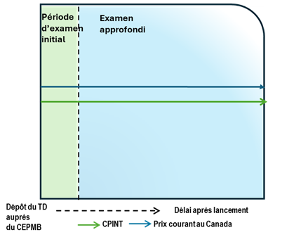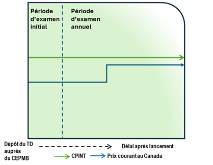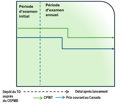 Ce graphique illustre le cas où, au cours de l’examen initial, le prix courant canadien est inférieur au prix de référence obtenu par la comparaison des prix internationaux (CPINT). Au cours de la période d’examen annuel, le prix courant canadien et le prix de référence de la CPINT diminuent au fil du temps. Le prix courant canadien demeure inférieur au prix de référence de la CPINT, ce qui ne donne pas lieu à un examen approfondi. Le graphique est divisé en deux parties, séparées par une ligne pointillée : la partie gauche représente la période d’examen initial des prix, et la partie droite représente la période d’examen annuel. La ligne bleue représente le prix courant canadien et la ligne verte représente la CPINT.