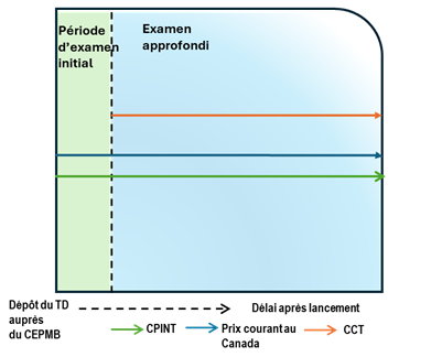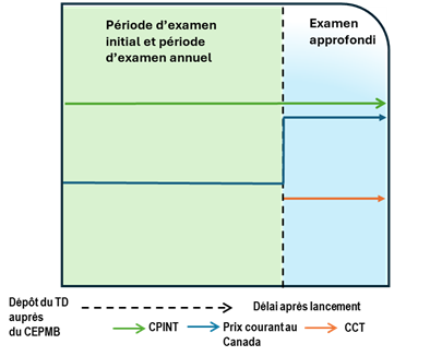 Ce graphique illustre le cas où, après un certain temps sur le marché, le prix courant canadien augmente plus que l’IPC, ce qui donne lieu à un examen approfondi. Au cours de l’examen approfondi, la CCT est réalisée et son résultat est inférieur au prix courant et au prix de référence de la CPINT. Le tableau est divisé en deux sections : la section verte pour la période d’examen initial des prix et la période d’examen annuel précédant l’augmentation des prix et la section bleue pour la période d’examen approfondi. La ligne bleue représente le prix courant canadien, la ligne verte représente la CPINT et la ligne orange représente la CCT.
