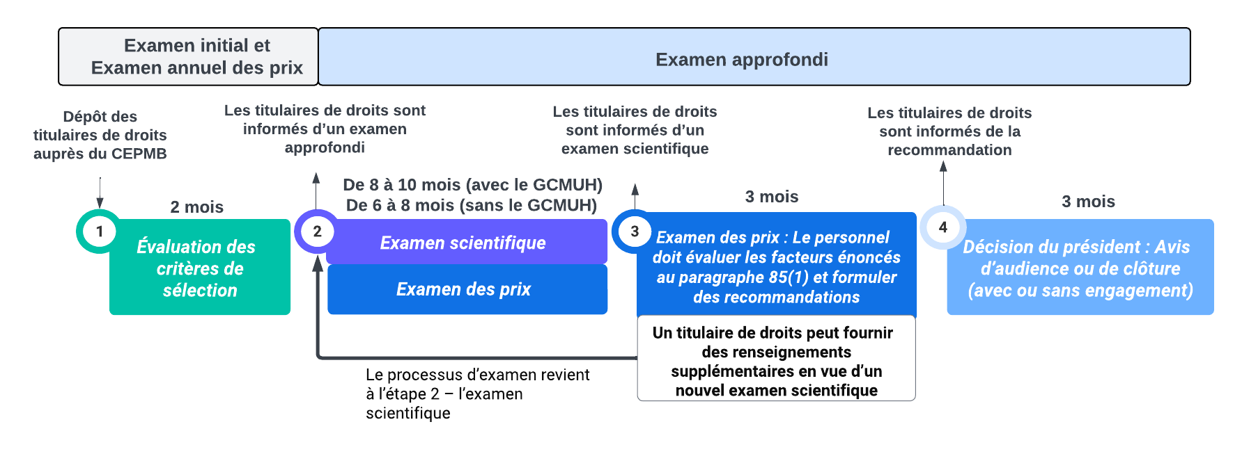 Ce diagramme illustre le processus d’examen des prix proposé par le CEPMB pour les médicaments brevetés. Il est divisé en plusieurs sections pour mettre en évidence les différentes étapes du processus.