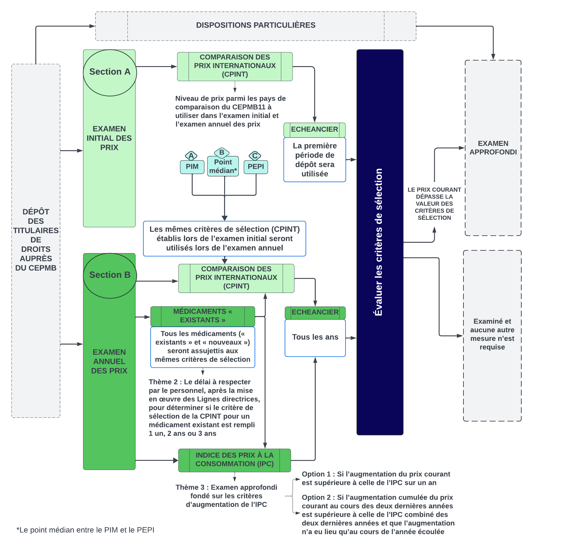 - Le CEPMB utilisera la première période de dépôt d’un médicament (premier dépôt semestriel) pour effectuer un examen initial des prix, avec les critères de sélection fondés sur la comparaison des prix internationaux (CPINT).