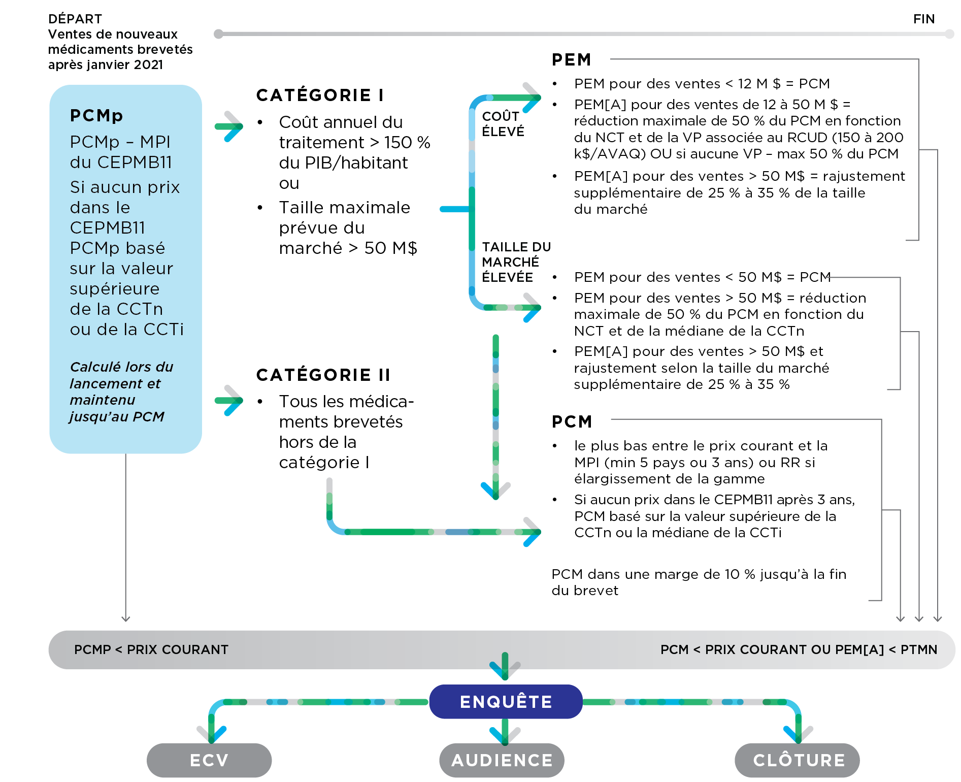 Premièrement, un PCMp est déterminé sur la base de la MPI des prix du CEPMB11 disponibles. S'il n'y a pas de prix dans les pays du CEPMB11, le PCMp est basé sur le maximum de la CCTn ou de la CCTi. Le PCMp est calculé lors du lancement et maintenu jusqu'à ce que le PCM soit fixé. Si le prix courant du médicament breveté est supérieur au PCMp, une enquête peut être ouverte, qui peut conduire soit à un ECV, soit à une audience, soit à la clôture de l'enquête.