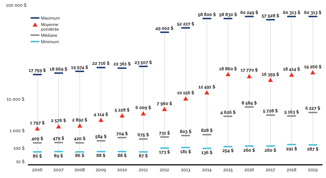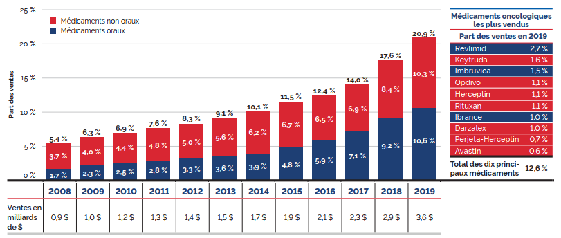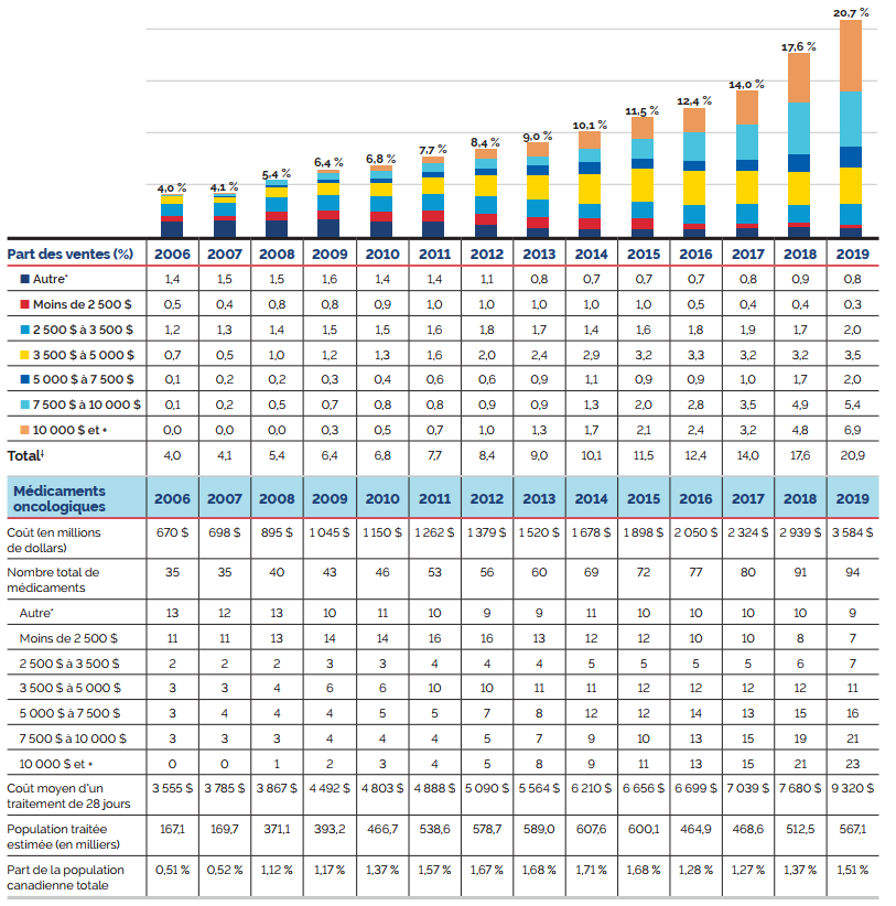 Notre travail pour achever le processus de modernisation de la réglementation s’est déroulé parallèlement à nos activités normales et habituelles dans le cadre de notre mandat de rapport, qui consiste à cerner et à analyser les principales tendances pharmaceutiques au Canada. En 2019-2020, le CEPMB a publié sept rapports d’analyse, trois recueils de graphiques et huit affiches de présentation sous la bannière de son Système national d’information sur l’utilisation des médicaments prescrits (SNIUMP). Le principal constat issu de tout ce travail est la hausse notable des ventes de médicaments à coûts élevés au Canada ces dernières années. Au cours des cinq dernières années, les ventes de médicaments brevetés ont augmenté en moyenne de 4,5 % par année, pour atteindre 17,2 milliards de dollars en 2019. L’utilisation croissante de médicaments à coûts élevés reste le principal facteur de coût pour les régimes d’assurance médicaments publics et privés canadiens. En effet, les traitements biologiques, oncologiques et ciblés très coûteux représentent aujourd’hui environ la moitié de toutes les ventes de médicaments brevetés au Canada. C’est une augmentation phénoménale par rapport aux 10 % d’il y a moins de dix ans. Pour replacer cette tendance dans son contexte, en 2009, un seul des dix médicaments brevetés les plus vendus au Canada avait un coût de traitement supérieur à mille dollars par année. En 2019, sept des dix médicaments brevetés les plus vendus avaient un coût annuel de traitement supérieur à dix mille dollars par année.